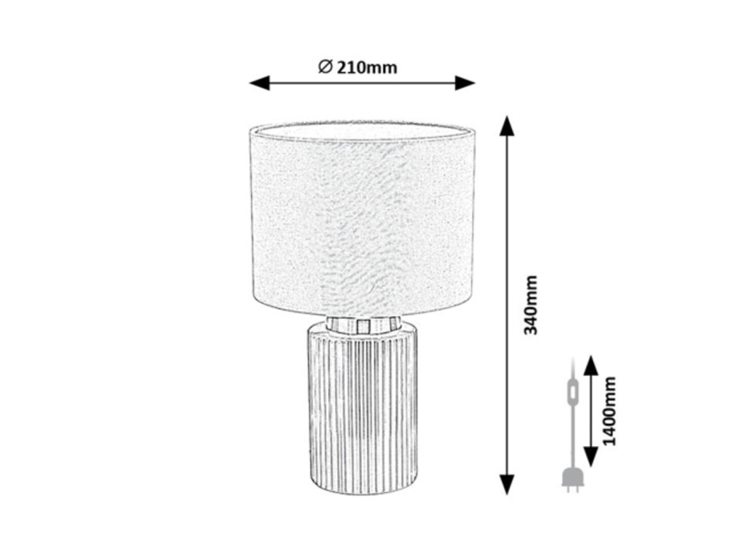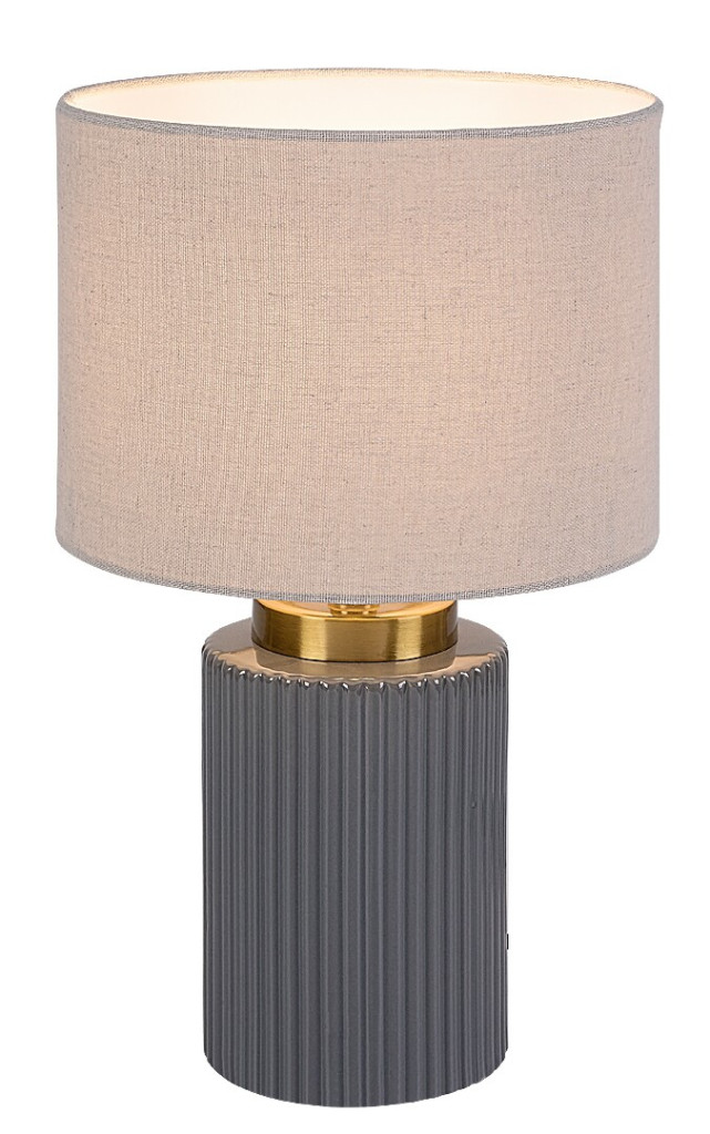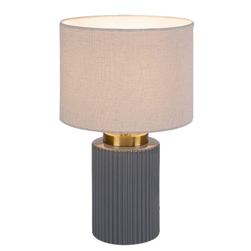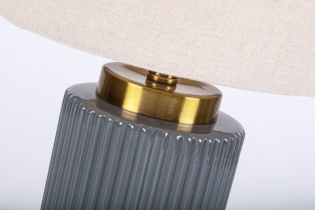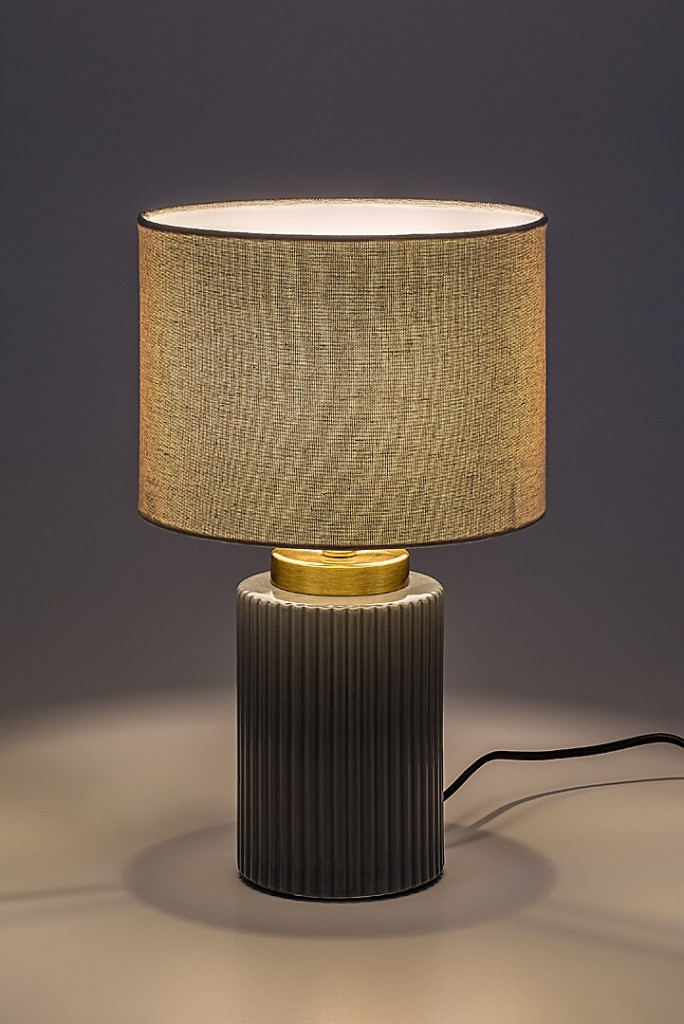 Szürke színű kerámia vázas asztali lámpa fehér színű textil bevonatos lámpa ernyővel, E14-es foglalattal, vezetékre szerelt kapcsolóval, textil bevonatos kábellel.