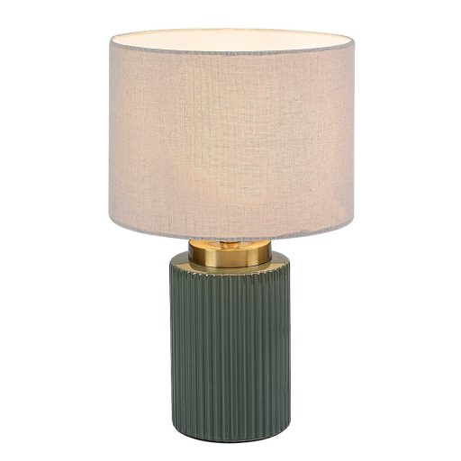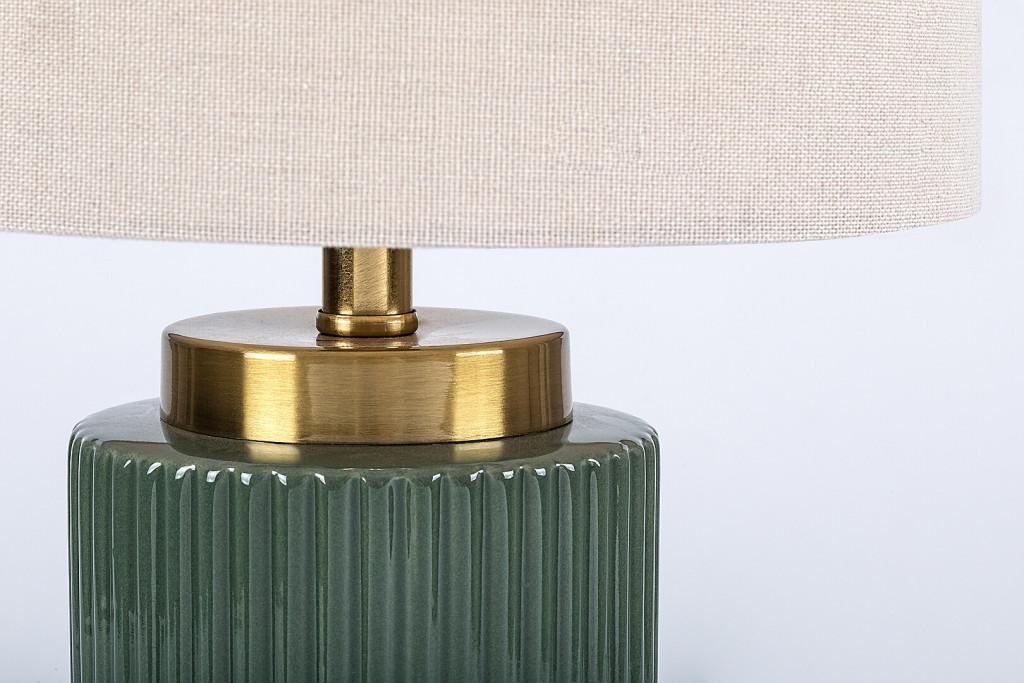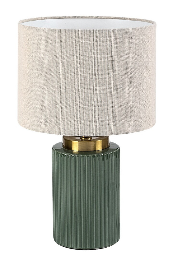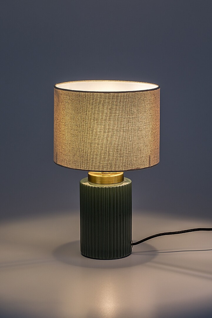 Zöld színű kerámia vázas asztali lámpa fehér színű textil bevonatos lámpa ernyővel, E14-es foglalattal, vezetékre szerelt kapcsolóval, textil bevonatos kábellel.