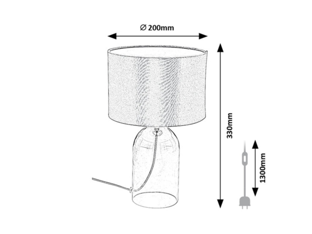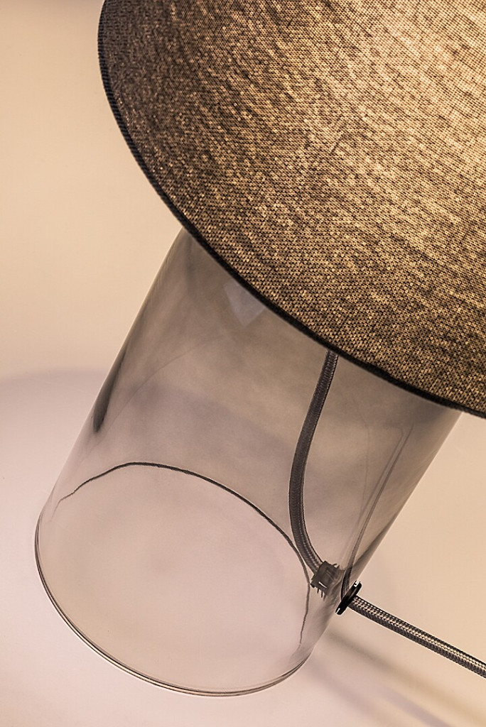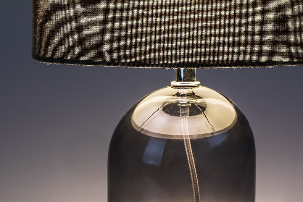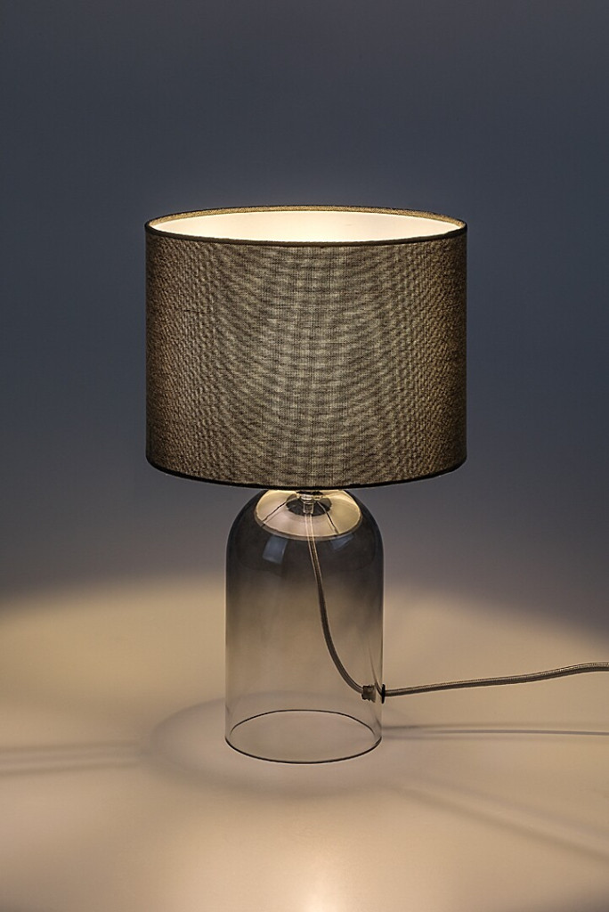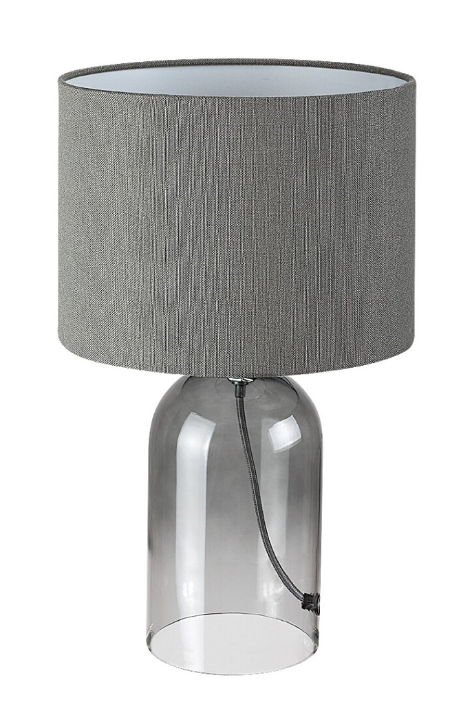 Füstszínű, áttetsző üveg lábas asztali lámpa szürke színű textil bevonatos lámpa ernyővel, E14-es foglalattal, vezetékre szerelt kapcsolóval, textil bevonatos kábellel.