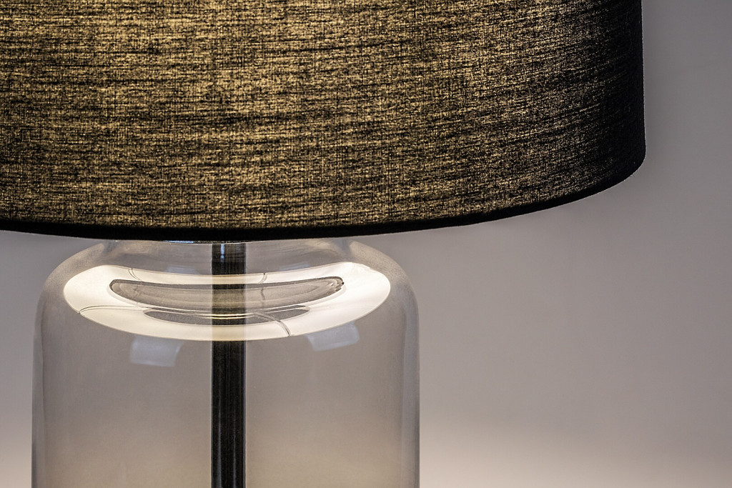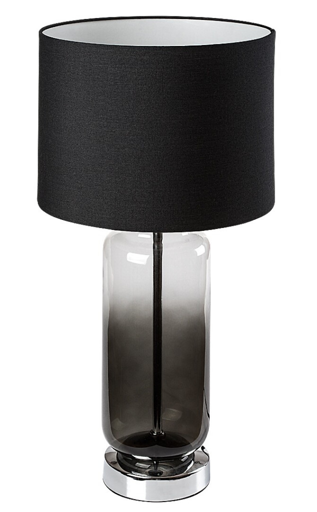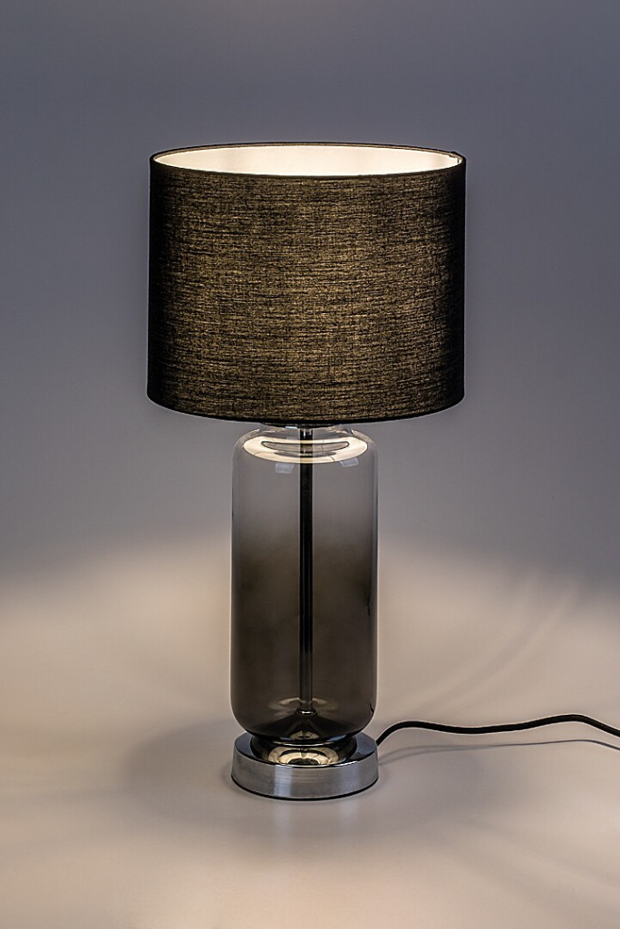 Króm színű fém és felfelé világosodó, füstszínű, áttetsző üveg lábas asztali lámpa sötét szürke színű textil bevonatos lámpa ernyővel, E14-es foglalattal, vezetékre szerelt kapcsolóval, textil bevonatos kábellel.