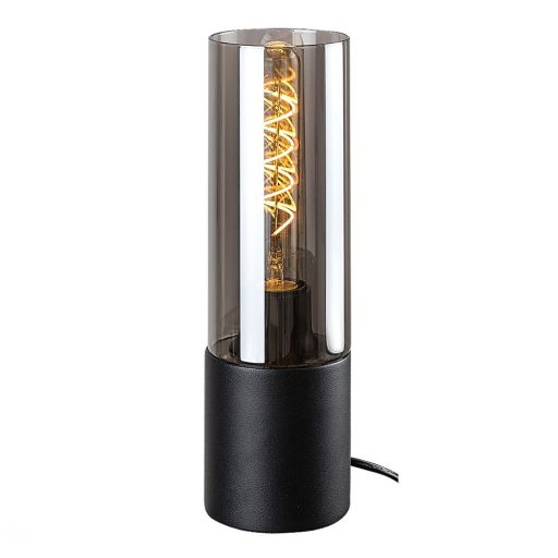 Fekete színű fém vázas asztali lámpa henger alakú, füstös üveg búrával, E27-es foglalattal, vezetékre szerelt kapcsolóval. A lámpa dekor, vagy filament fényforrással mutat a legjobban. A lámpát fényforrás nélkül szállítjuk.