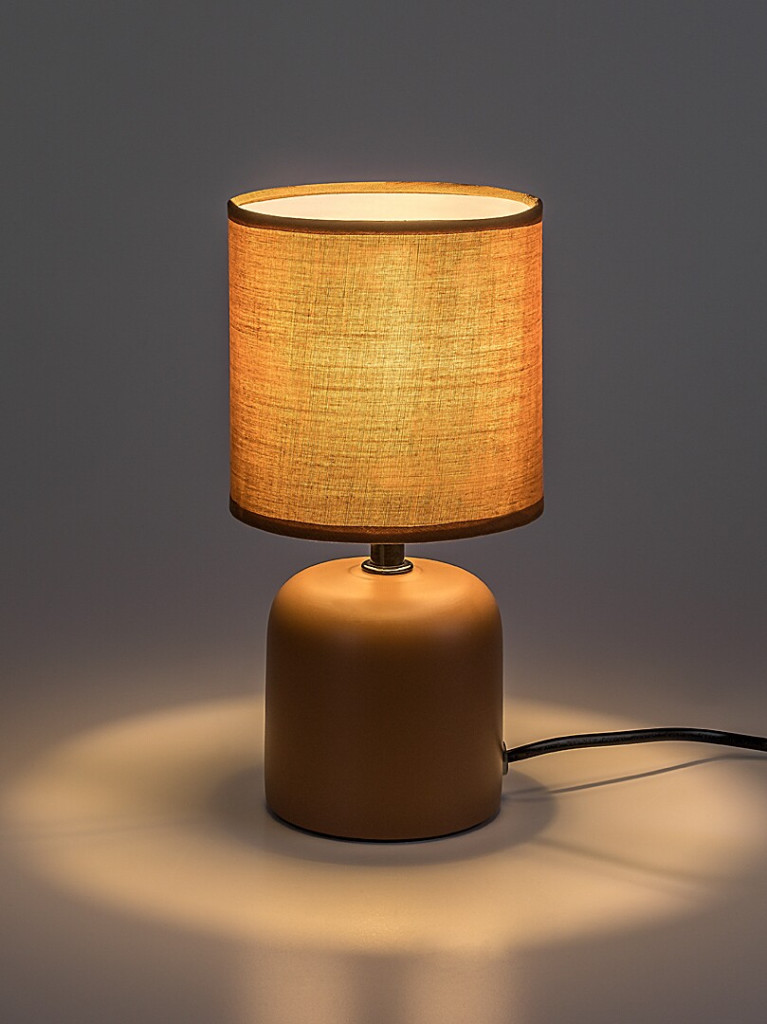 Barna színű kerámia vázas asztali lámpa barna színű textil bevonatos lámpa ernyővel, E14-es foglalattal, vezetékre szerelt kapcsolóval.