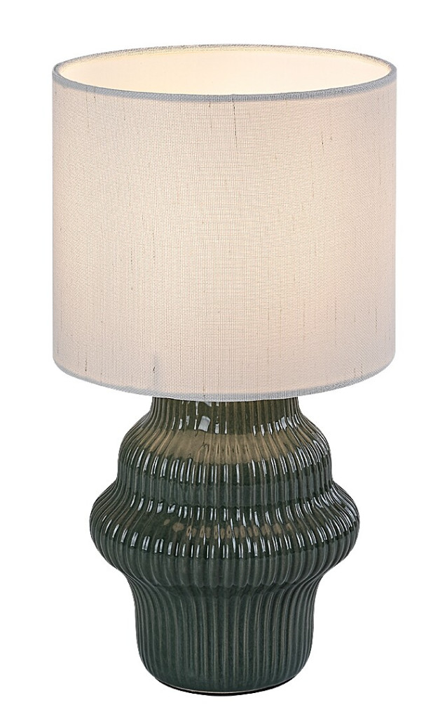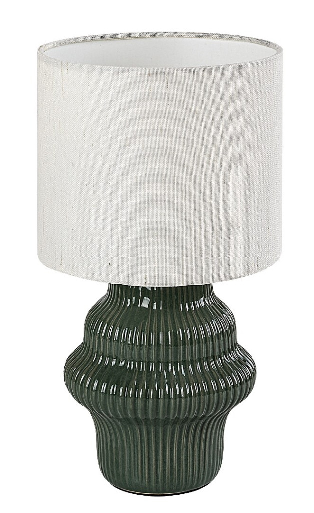 Zöld színű kerámia vázas asztali lámpa fehér színű textil bevonatos lámpa ernyővel, E14-es foglalattal, vezetékre szerelt kapcsolóval.