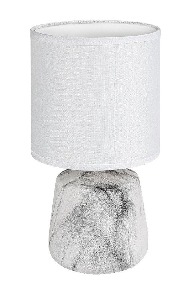 Márványt imitáló kerámia vázas asztali lámpa fehér színű textil bevonatos lámpa ernyővel, E14-es foglalattal, vezetékre szerelt kapcsolóval.