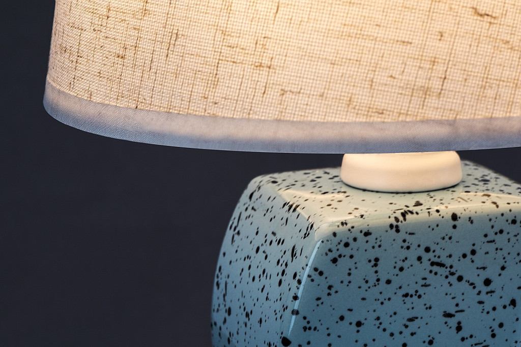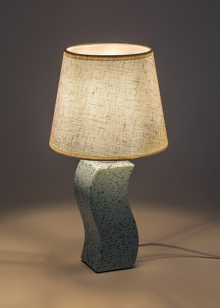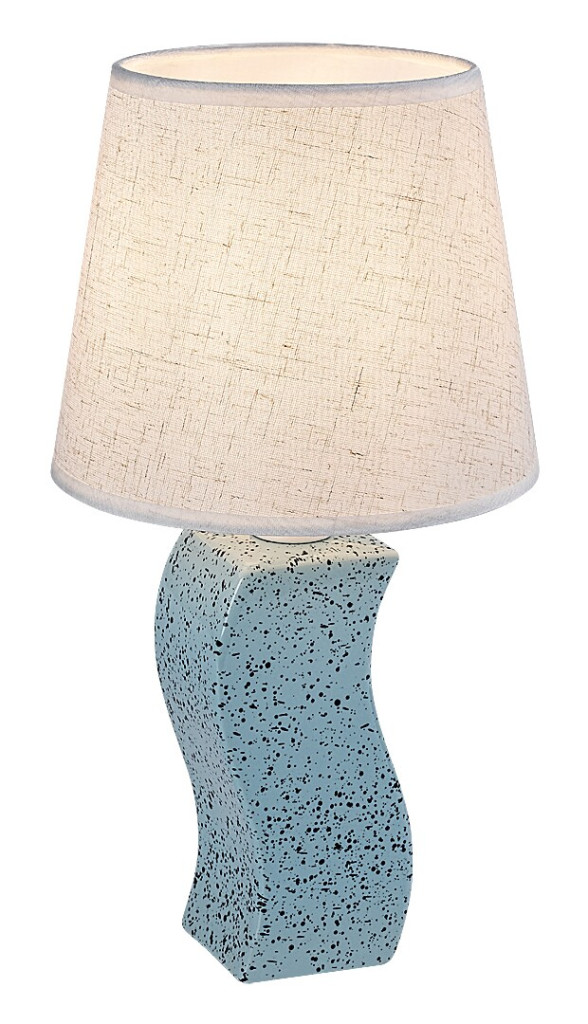 Kék színű kerámia vázas asztali lámpa bézs színű textil bevonatos lámpa ernyővel, E14-es foglalattal, vezetékre szerelt kapcsolóval.