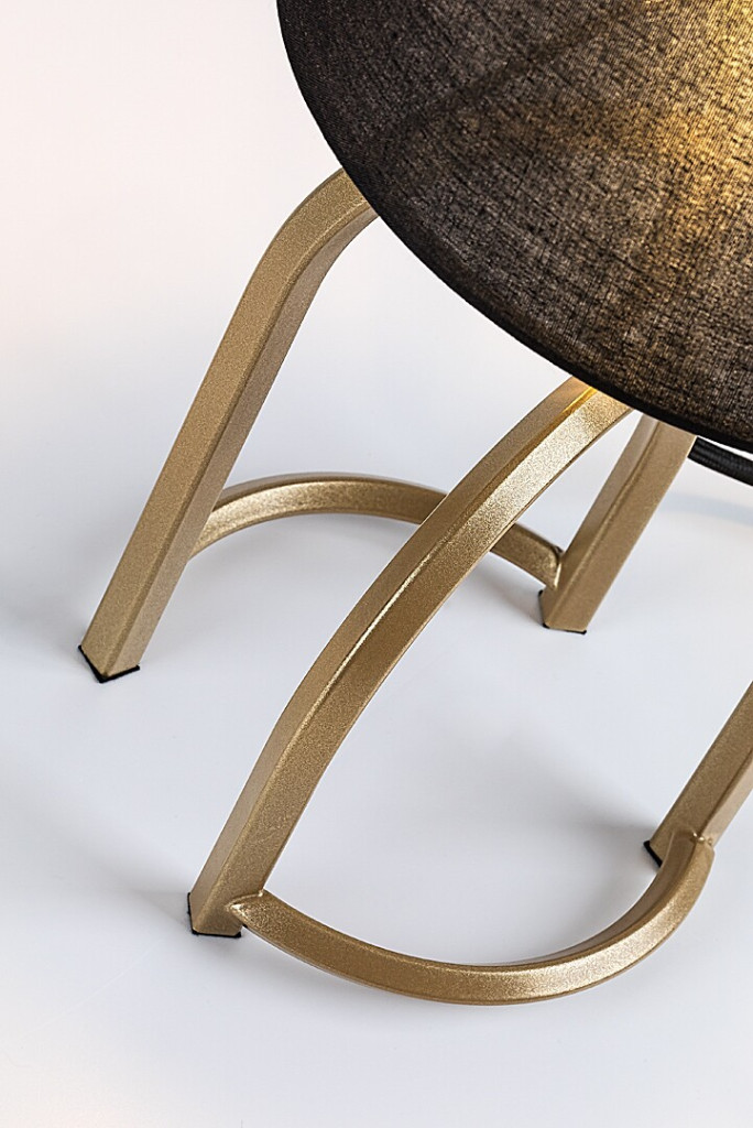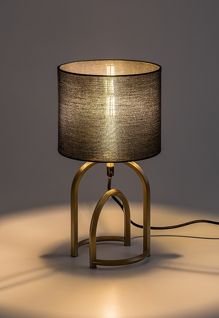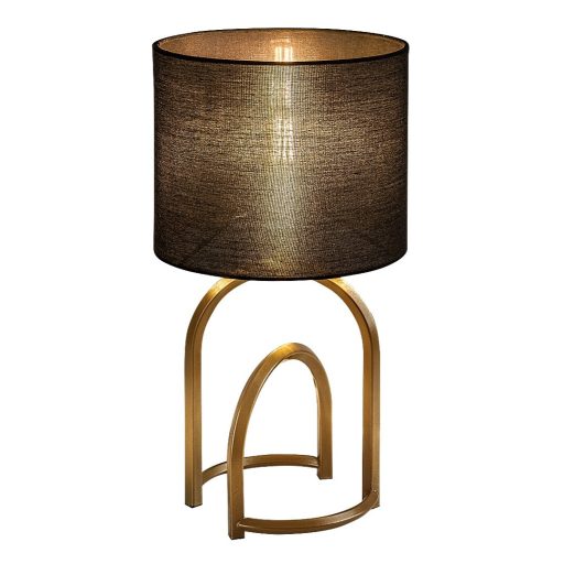Arany színű fém vázas asztali lámpa fekete színű textil bevonatos lámpa ernyővel, E14-es foglalattal, vezetékre szerelt kapcsolóval, textil bevonatos kábellel.