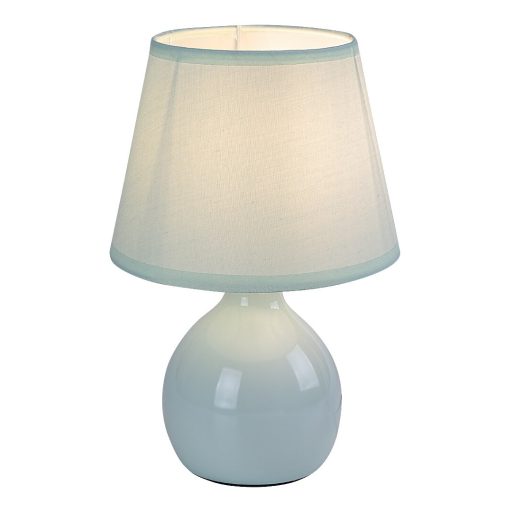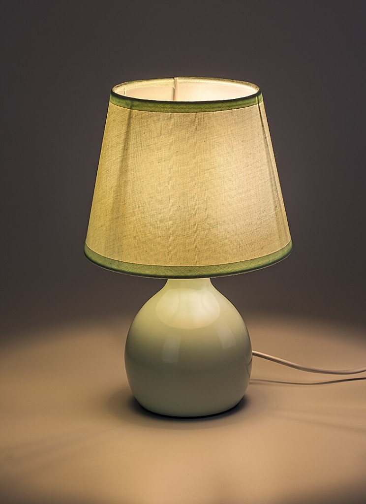 Világos zöld színű kerámia vázas asztali lámpa zöld színű textil bevonatos lámpa ernyővel, E14-es foglalattal, vezetékre szerelt kapcsolóval.