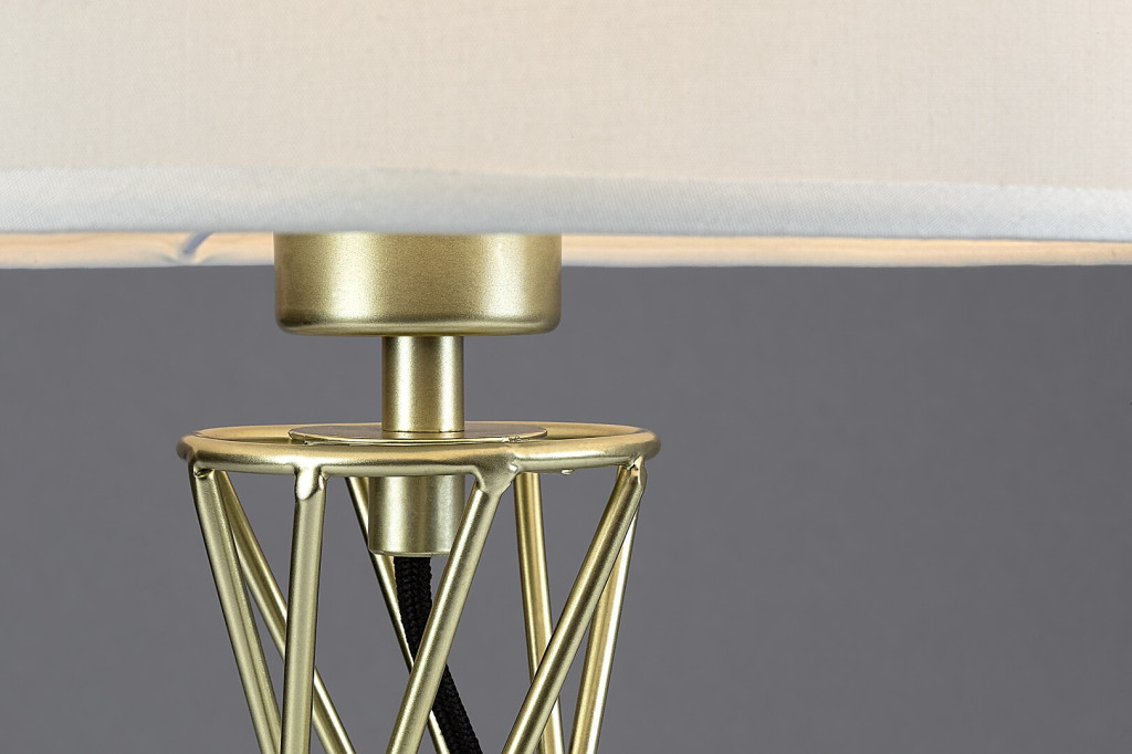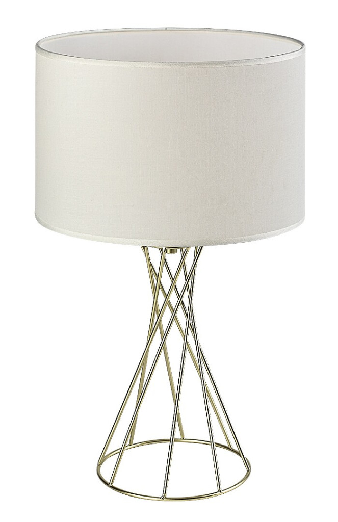 Arany színű fém vázas asztali lámpa fehér színű textil bevonatos lámpa ernyővel, E27-es foglalattal, vezetékre szerelt kapcsolóval, textil bevonatos kábellel.