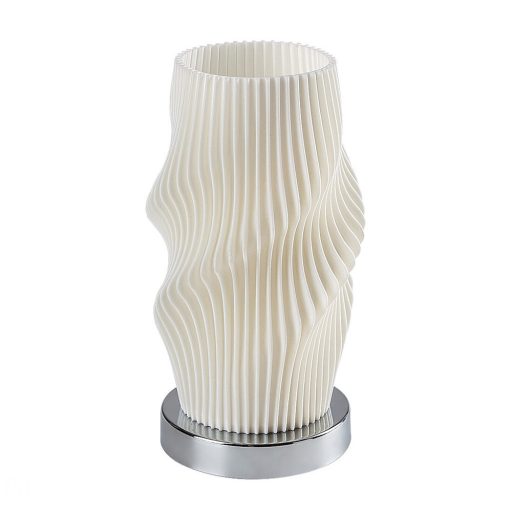 Króm színű fém vázas asztali lámpa 3D nyomtatással készült, fehér színű, barázdált műanyag búrával, E14-es foglalattal, vezetékre szerelt kapcsolóval.