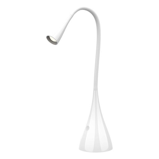 Fehér színű fém és műanyag íróasztali lámpa állítható fejjel, meleg fehér színhőmérsékletű beépített LED fényforrással, érintéssel szabályozható fényerővel(10,40,100%).