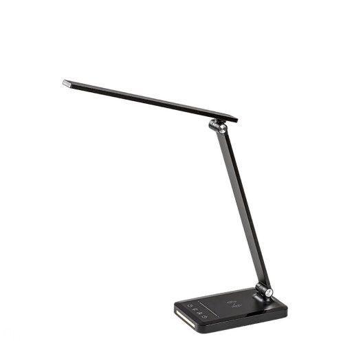 Fekete színű fém és műanyag asztali lámpa 190 lumen fényerejű beépített LED fényforrással, indukciós töltővel. A lámpa fényereje és színhőmérsékelte (3000K-meleg -6500K-hideg fehérig) érintéssel szabályozható. A lámpát USB kábellel szállítjuk, melyet dugvillába csatlakoztatva tudjuk a terméket konnektorba dugni. Az indukciós töltővel csak az arra alkalmas telefonokat lehet tölteni.