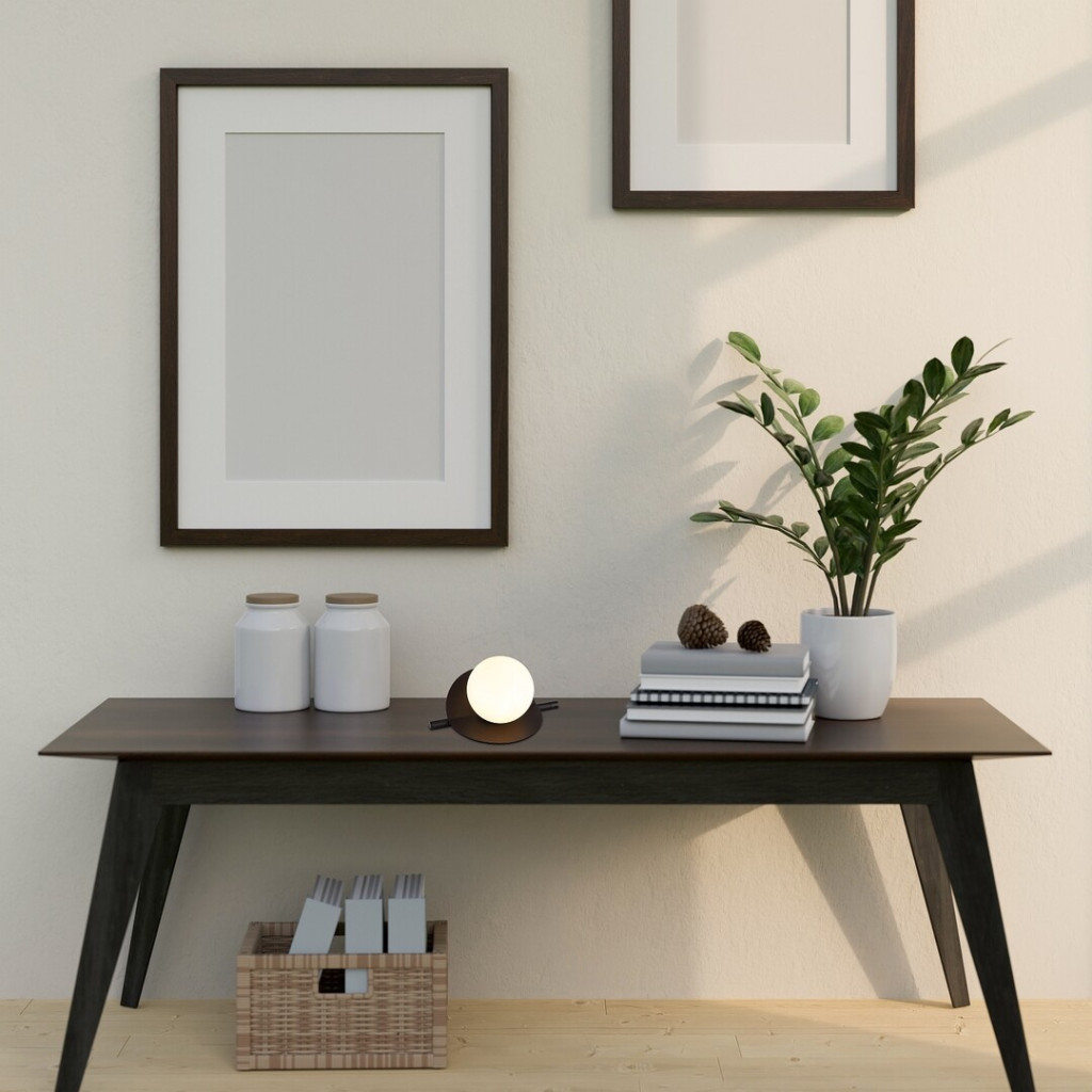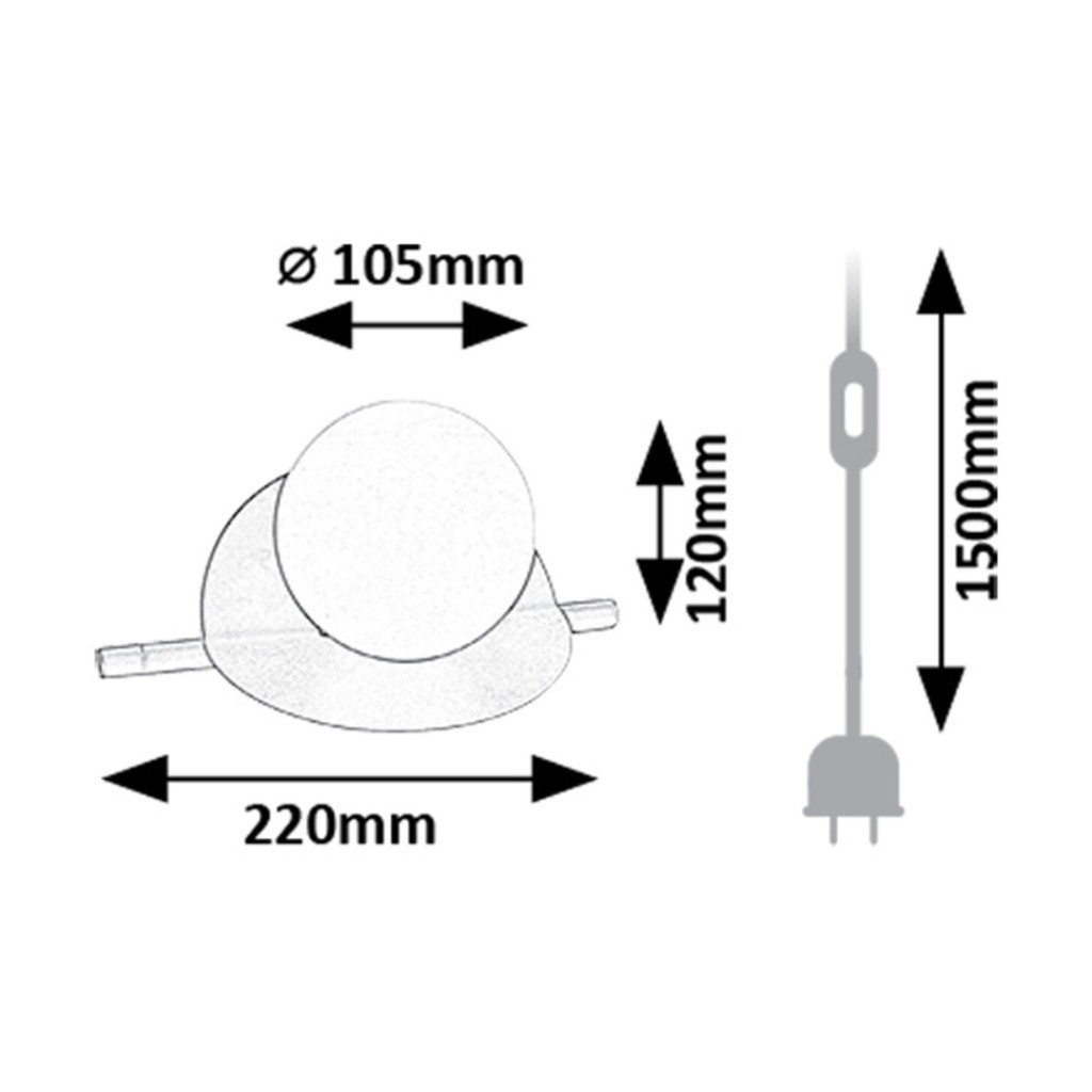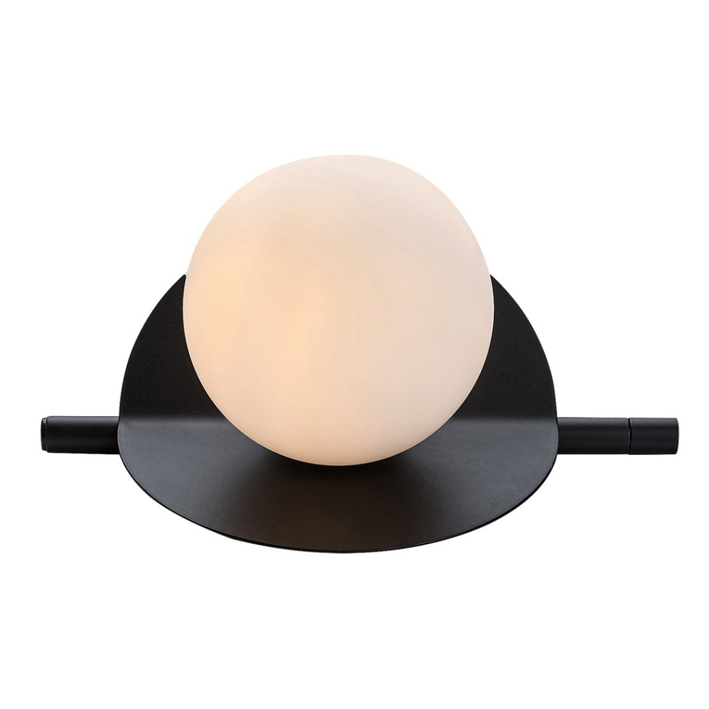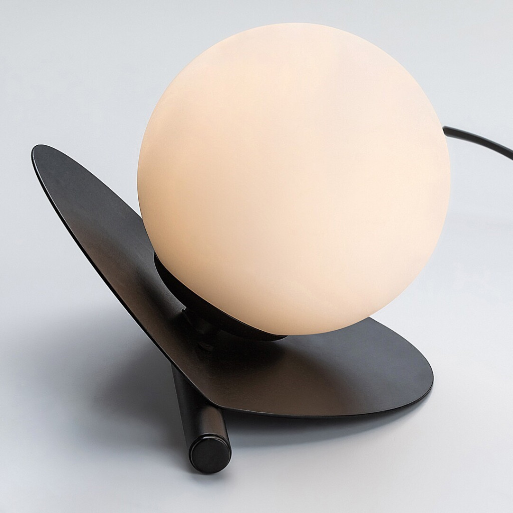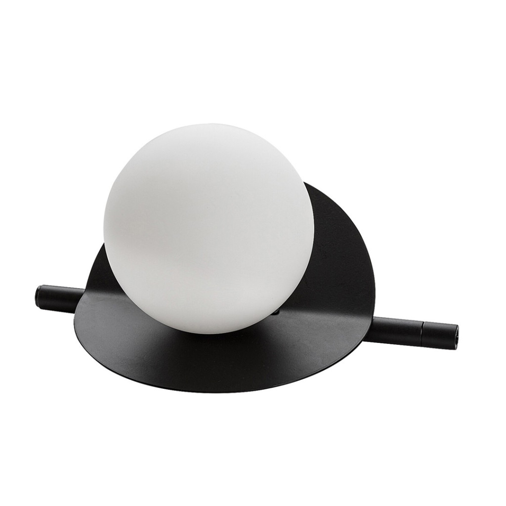 Fekete színű fém vázas asztali lámpa hajlított fémlap hátteres, fehér színű, gömb alakú üveg búrával, G9-es foglalattal, vezetékre szerelt kapcsolóval.