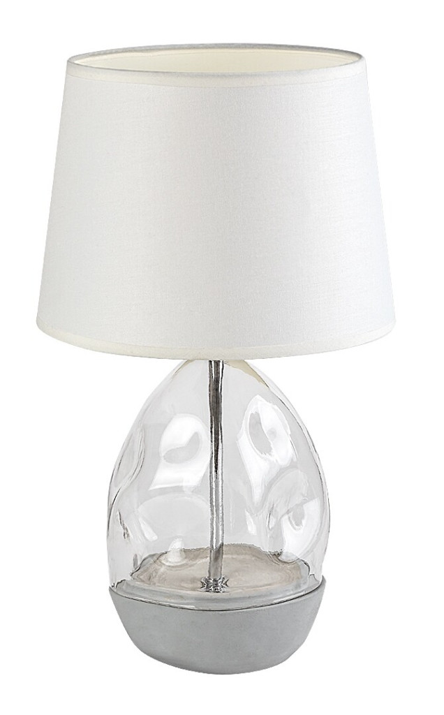 Fehér színű kerámia és átlátszó üveg talpas asztali lámpa fehér színű textil búrával, E27-es fényforrással, vezetékre szerelt kapcsolóval.