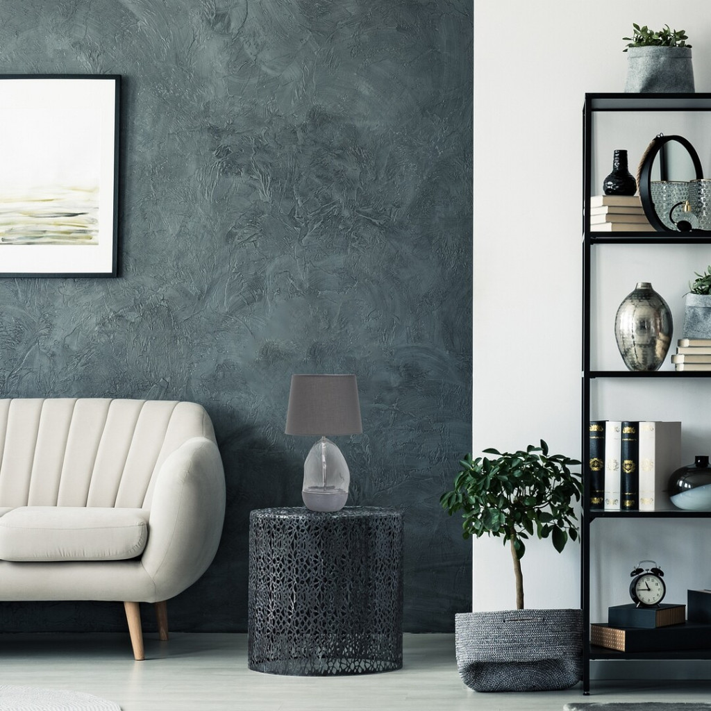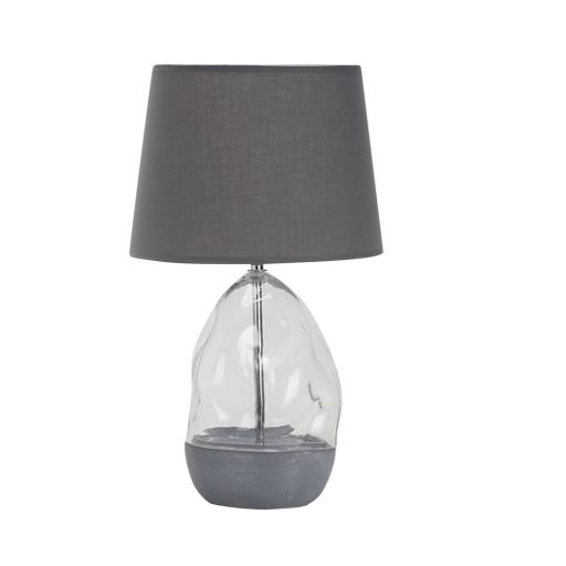Szürke színű kerámia és átlátszó üveg talpas asztali lámpa szürke színű textil búrával, E27-es fényforrással, vezetékre szerelt kapcsolóval.