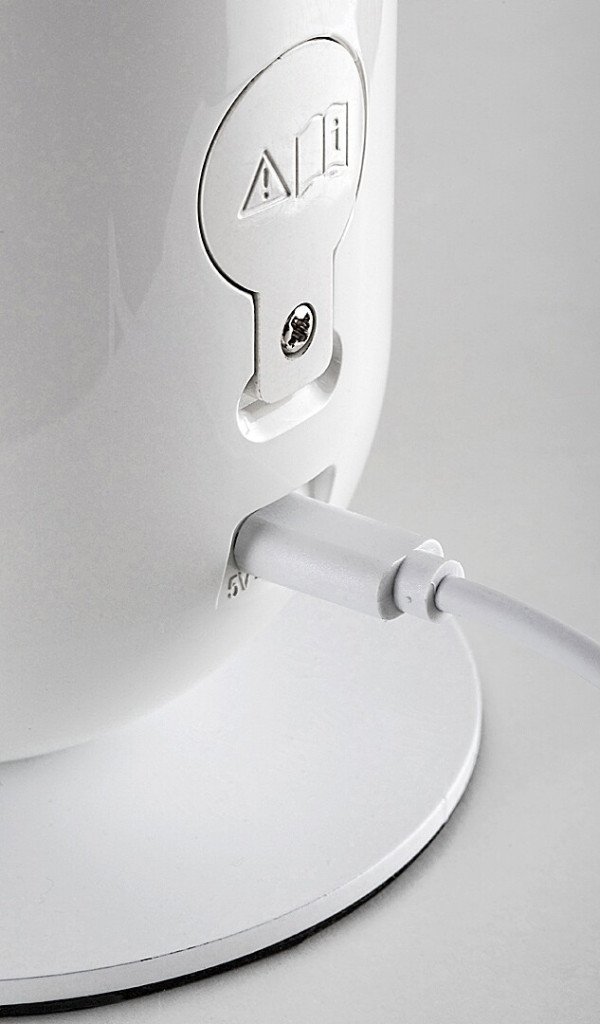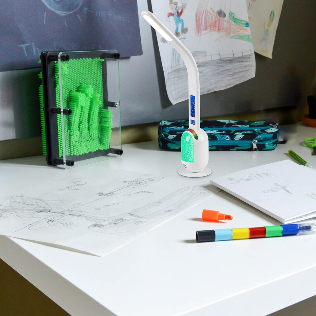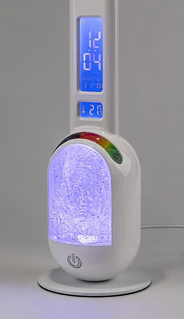 Ez a modern lámpa műanyagból, fekete testtel és fehér búrával, korong alakú dísztalppal készül. Szára vékony és lapos, alulsó részén két kijelzővel a dátum/idő és hőmérséklet számára. A test dísztalppal érintkező, öblös része áramoltatható csillámos anyaggal van megtöltve – ez a rész külön kapcsolható. A lámpa RGB világításra képes, aminek köszönhetően a csillámos töltet a legkülönfélébb színekben pompázhat. A design lámpa beépített LED fényforrással rendelkezik, amely természetes fehér fénnyel világít, ezenkívül elemet is tartalmaz. A fényerő a lámpa alsó részén elhelyezett érintőkapcsolóval állítható.