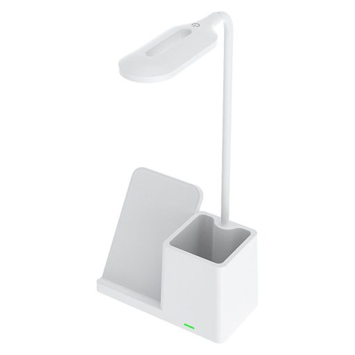 Fehér színű műanyag asztali lámpa 200 lumen fényerejű beépített LED fényforrással, indukciós töltővel, írószer tartóval. A lámpa fényereje és színhőmérsékelte (3000K-meleg, 4000K-természetes, 6500K-hideg fehér) érintéssel szabályozható. A lámpát USB kábellel szállítjuk, melyet dugvillába csatlakoztatva tudjuk a terméket konnektorba dugni. Az indukciós töltővel csak az arra alkalmas telefonokat lehet tölteni.