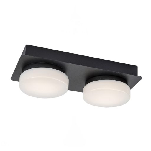Fekete színű fém fürdőszobai mennyezeti lámpa fehér színű műanyag búrával, természetes fehér színhőmérsékletű beépített LED fényforrással, IP44-es védelemmel.