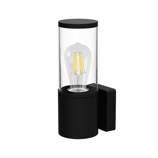Kültéri fali lámpa 1db E27-es foglalattal, matt fekete és átlátszó fém és műanyag lámpatesttel, IP44-es védettséggel.