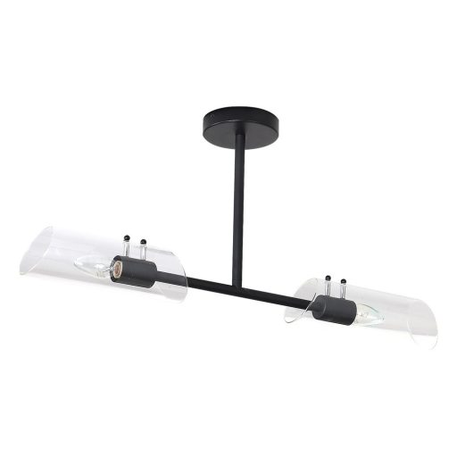 Fekete színű fém vázas fürdőszobai mennyezeti lámpa hengeres, ferdén vágott, átlátszó üveg búrával, E14-es foglalattal, IP44-es védelemmel.
