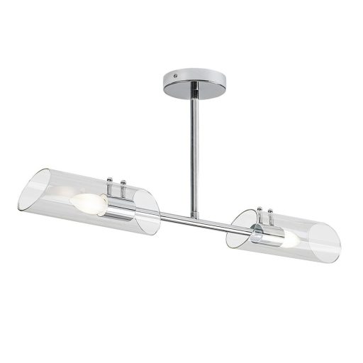 Króm színű fém vázas fürdőszobai mennyezeti lámpa hengeres, ferdén vágott, átlátszó üveg búrával, E14-es foglalattal, IP44-es védelemmel.