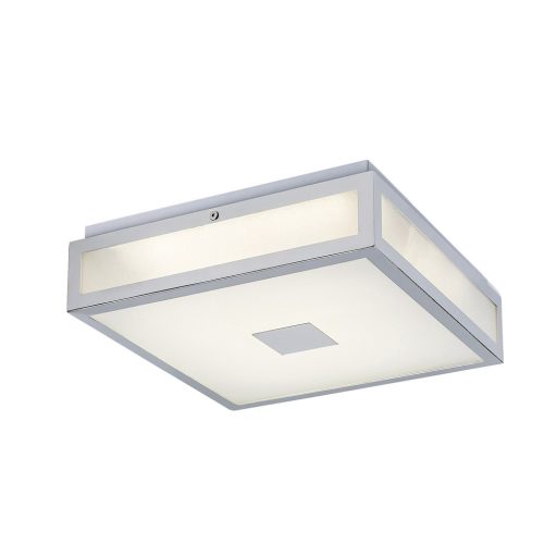 30cm széles, króm színű fém vázas szögletes fürdőszobai mennyezeti lámpa fehér színű üveg búrával, természetes fehér színhőmérsékletű beépített LED fényforrással, IP44-es védelemmel.