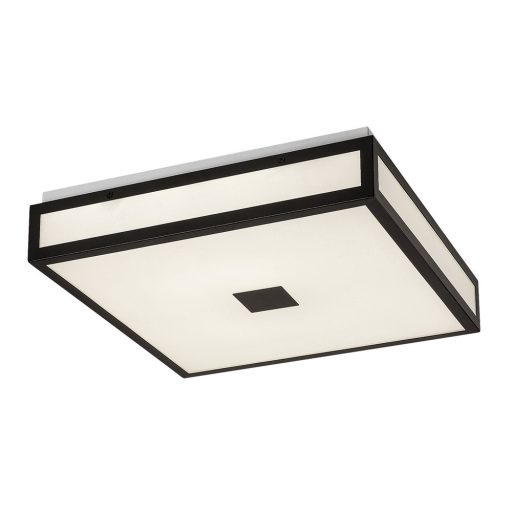 40cm széles, fekete színű fém vázas szögletes fürdőszobai mennyezeti lámpa fehér színű üveg búrával, természetes fehér színhőmérsékletű beépített LED fényforrással, IP44-es védelemmel.