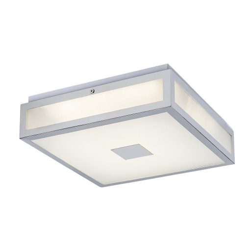 40cm széles, króm színű fém vázas szögletes fürdőszobai mennyezeti lámpa fehér színű üveg búrával, természetes fehér színhőmérsékletű beépített LED fényforrással, IP44-es védelemmel.
