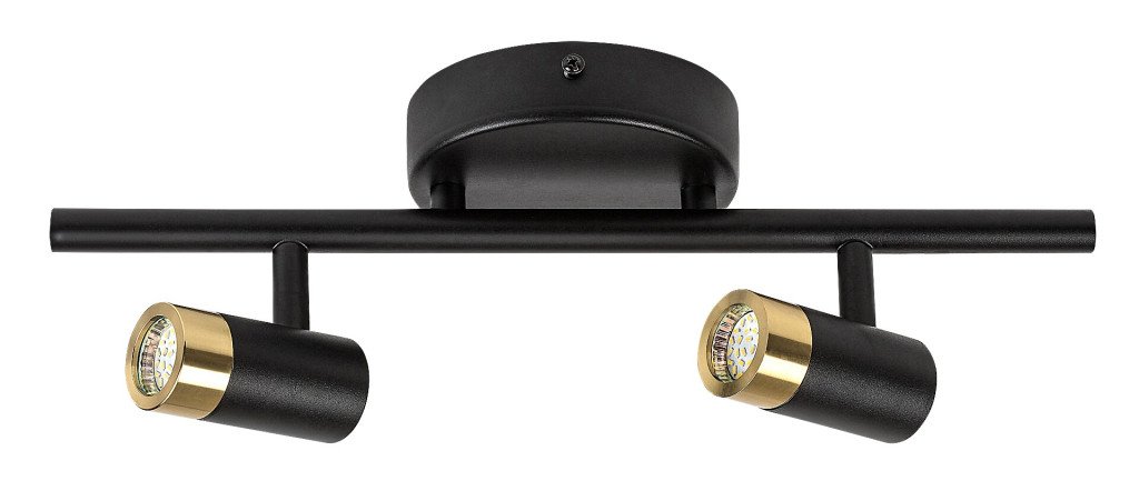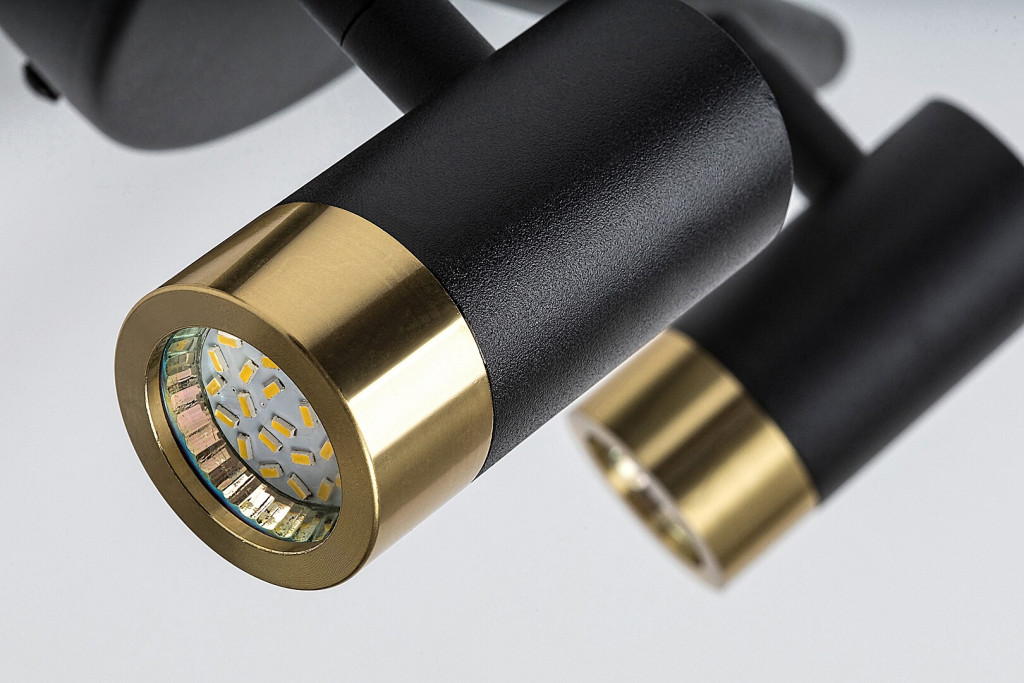 Fekete színű fém vázas fali lámpa arany dekoros, állítható fejjel, műanyag átlátszó véggel, természetes fehér színhőmérsékletű beépített LED fényforrással, IP44-es védelemmel.