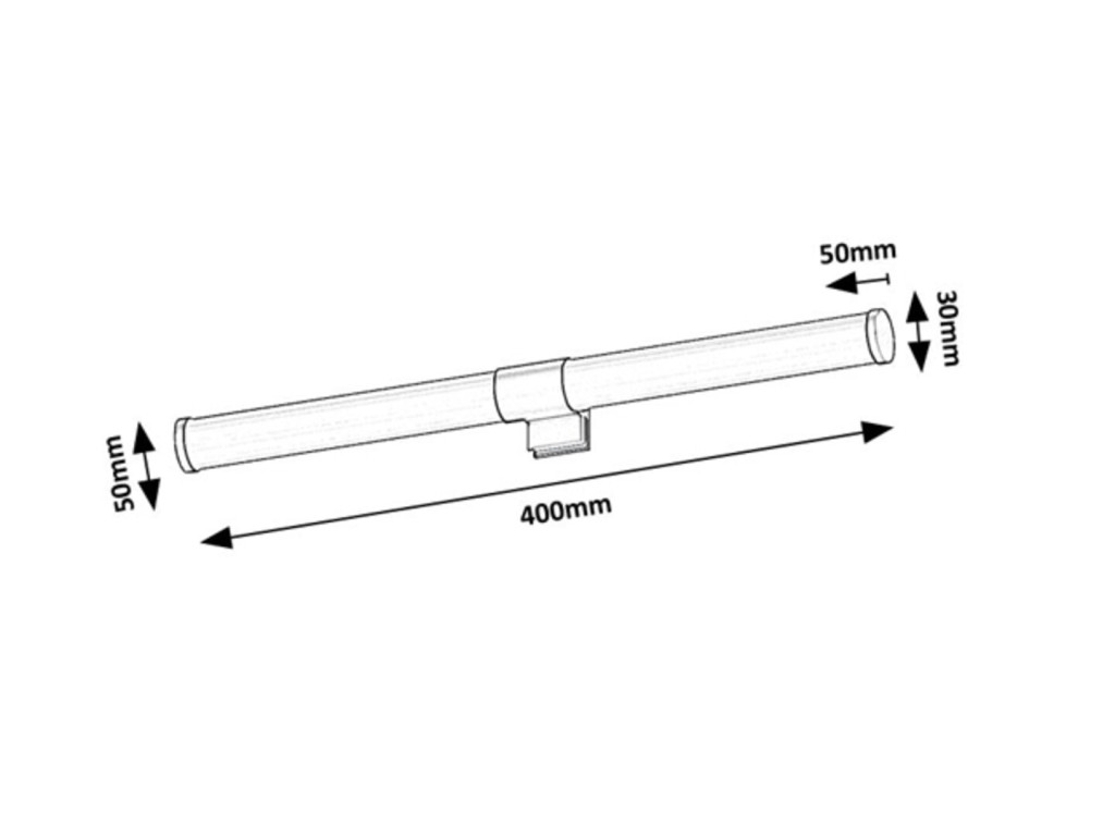 40cm hosszú, fekete színű műanyag vázas fali lámpa fehér színű műanyag búrával, természetes fehér színhőmérsékletű beépített LED fényforrással, IP44-es védelemmel.