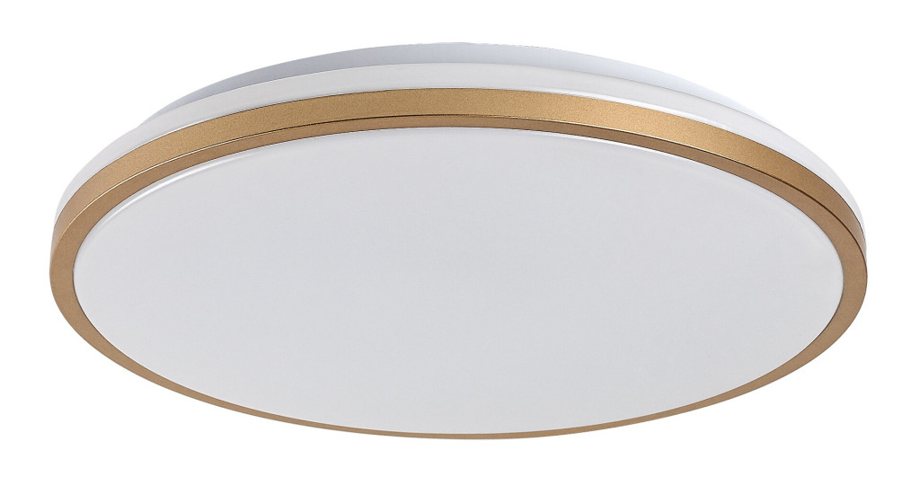 Fehér színű fém vázas mennyezeti lámpa arany és fehér színű műanyag búrával, természetes fehér színhőmérsékletű beépített LED fényforrással, IP44-es védelemmel.