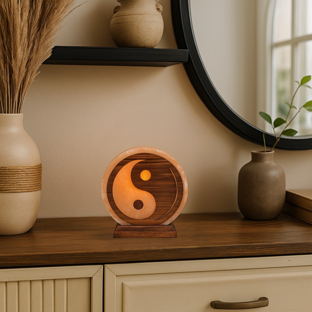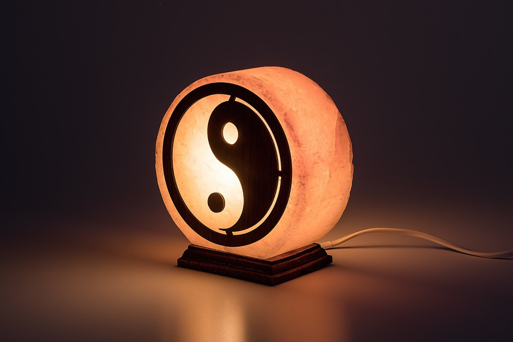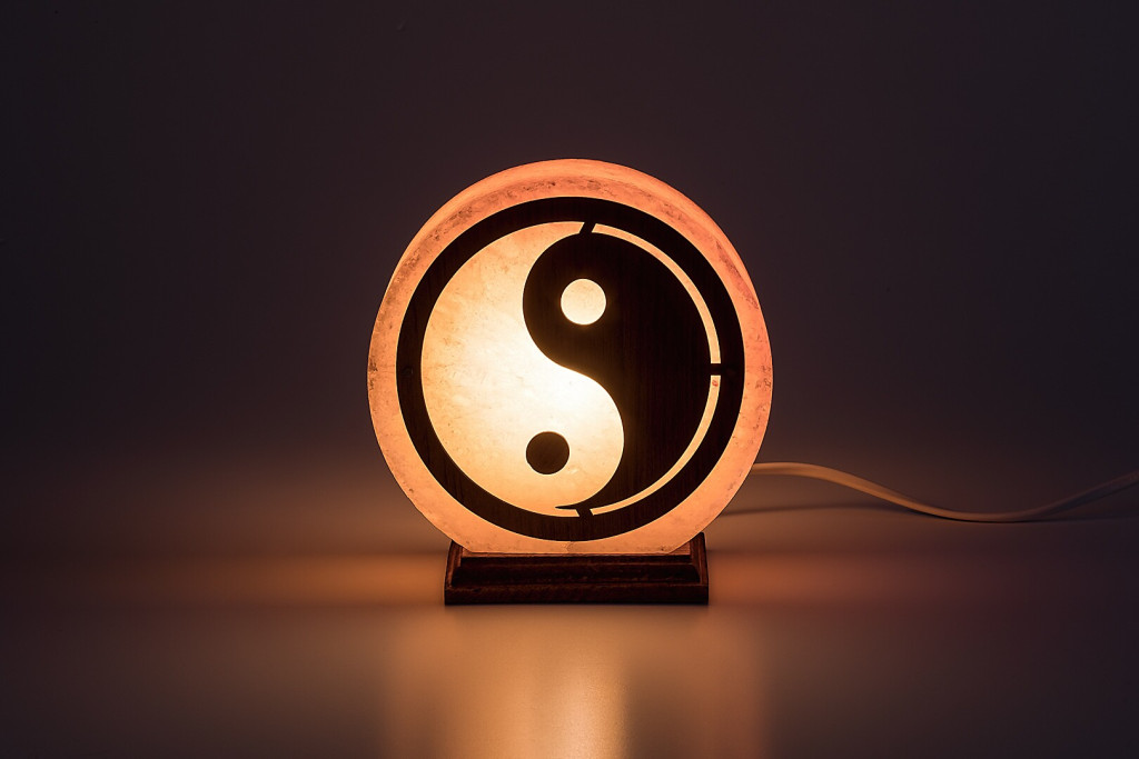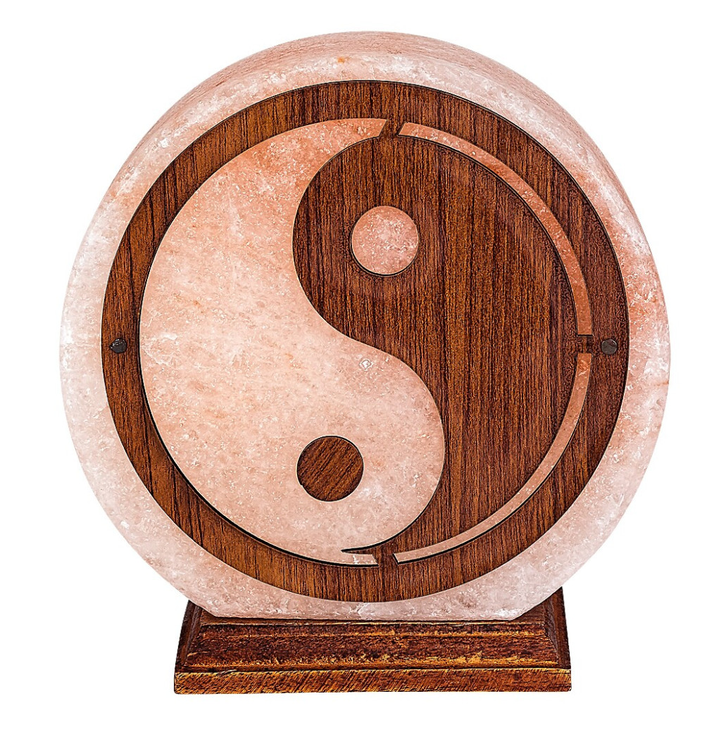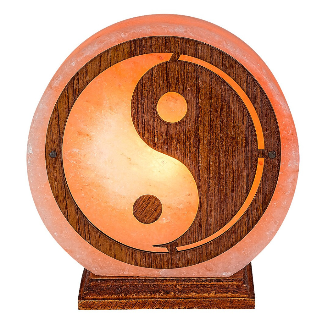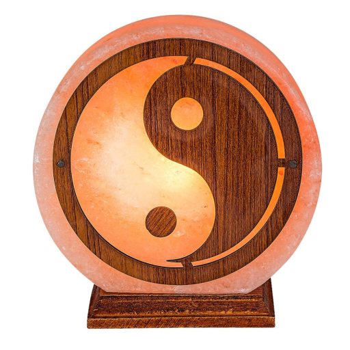 Fa talpas, jin-jang motívumos narancs színű sólámpa 1db E14-es foglalattal, vezetékre szerelt kapcsolóval.