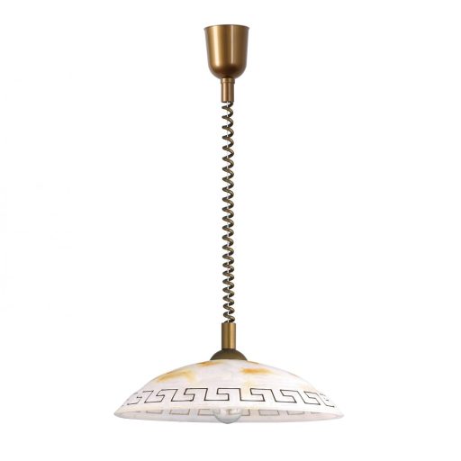 Klasszikus stílusú, lehúzható függeszték, arany színű műanyag vázzal, fehér színű, görög mintás, alabástrom üveg búrával.
