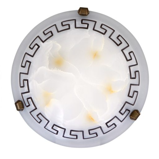 Modern stílusú mennyezti lámpa, fém vázzal, fehér alapon, barna, görög mintás alabástrom üveg búrával.