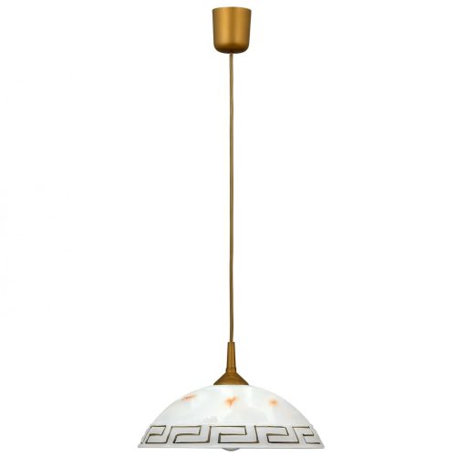 Klasszikus stílusú függeszték, arany színű műanyag vázzal, fehér színű, görög mintás, alabástrom üveg búrával.