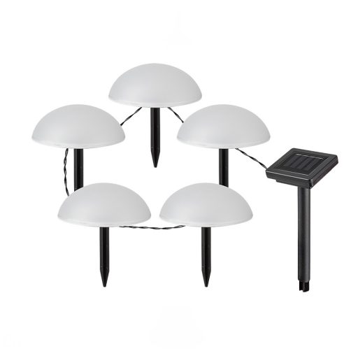 A modern stílusú Treppio talajba szúrható napelemes lámpa praktikus és mutatós megoldás a kerti világításhoz. A fekete színben, teljes egészében műanyagból készült modellt a napelemet tartalmazó egységen kívül öt sorba kötött, fehér búrával ellátott kerek lámpa alkotja. A Treppio beépített LED fényforrásokkal rendelkezik, amelyek teljesítménye 1 W, fényerejük búrával 1,2 lumen, búra nélkül 6 lumen, színhőmérsékletük pedig 4000 K. A természetes fehér fénnyel világító fényforrások élettartama 20 000 óra, az akkumulátor feszültsége 1,2 V, kapacitása 600 mAh. A lámpák fényerejüket a körülményeknek megfelelően változtatják. A kapcsolóval ellátott Treppio méretei a következők: teljes hossza 4000 mm, a lámpák magassága 60 mm, átmérőjük 150 mm. A talajba szúrható lámpa IP44-es védettsége garantálja, hogy legfeljebb 1 mm átmérőjű tárgyak behatolása ellen, valamint bármilyen irányból fröccsenő víz ellen védett.