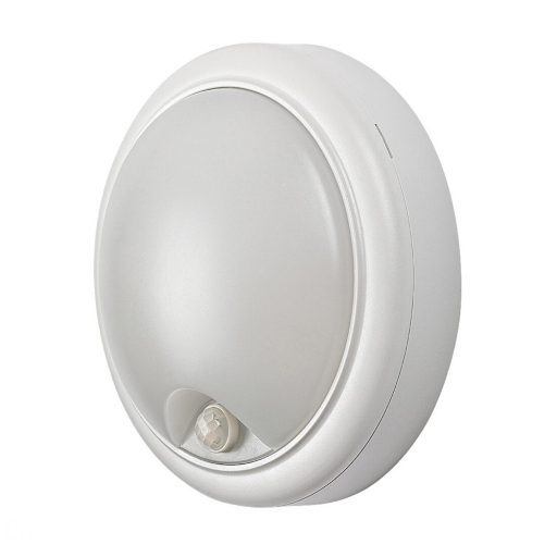 Fehér színű műanyag kültéri mozgás-érzékelős fali lámpa természetes fehér színhőmérsékletű beépített LED fényforrással, IP54-es védelemmel.