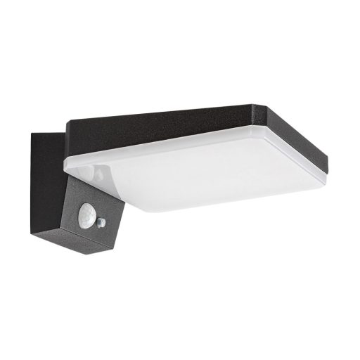 Napelemmel működő fekete színű fém vázas, fehér műanyag búrás kültéri fali lámpa beépített természetes fehér színhőmérsékletű LED fényforrással, IP54-es védelemmel. Alámpát mozgás- és fényérzékelővel is ellátták: a szenzor 8 méter távolságból, 110°-os látószögben érzékeli a mozgást.