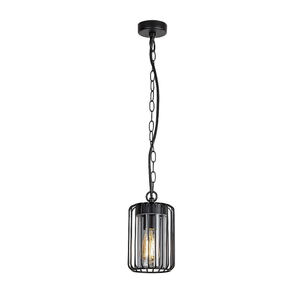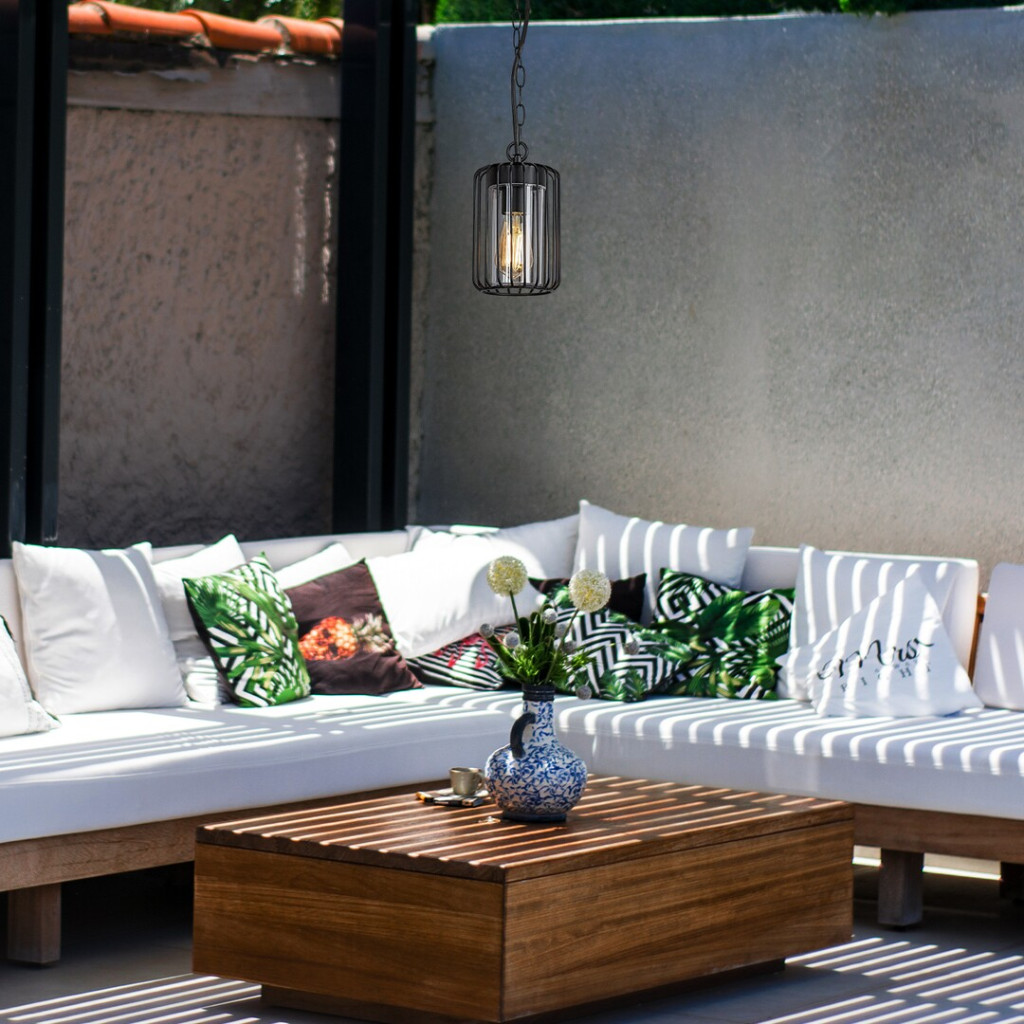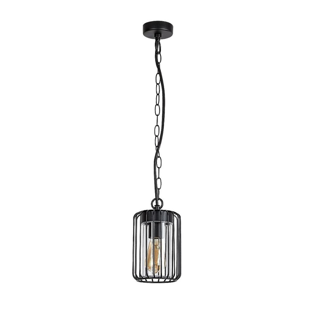 Fekete színű fém kültéri függesztett lámpa átlátszó műanyag betéttel, kívül fémrács búrával, 1db E27-es foglalattal, IP44-es védelemmel.