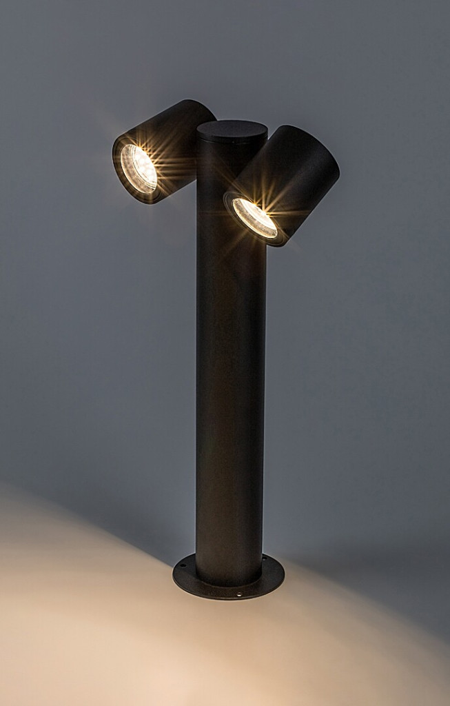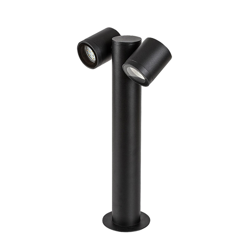 Fekete színű fém kültéri álló lámpa üveg betétes, billenthető fejjel, GU10-es foglalattal, IP44-es védelemmel.