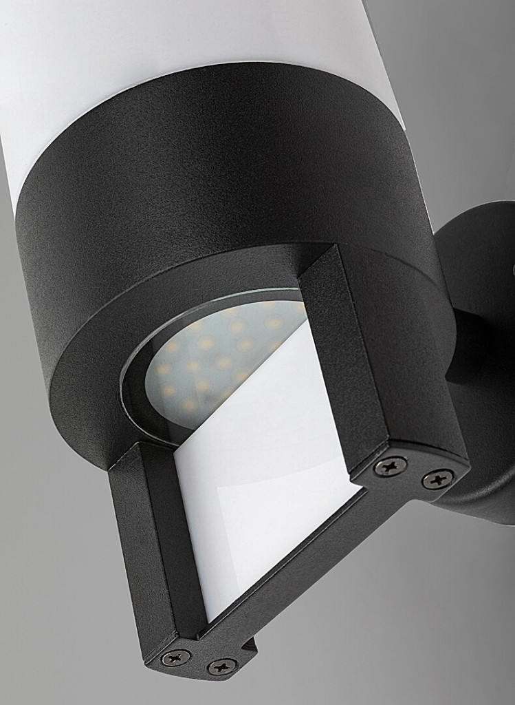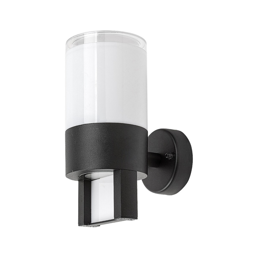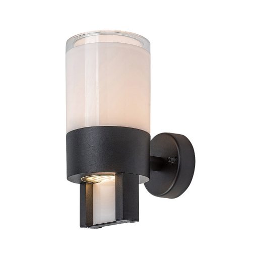 Fekete színű fém kültéri fali lámpa fehér színű műanyag búrával, meleg fehér színhőmérsékletű beépített LED fényforrással, IP44-es védelemmel.