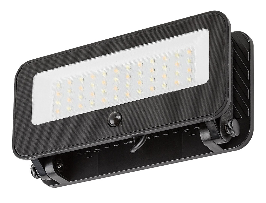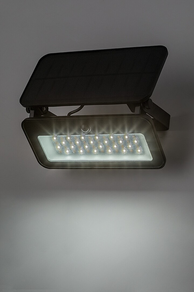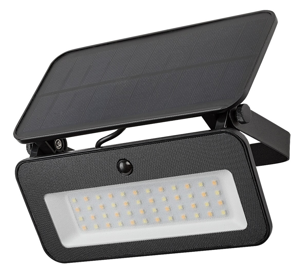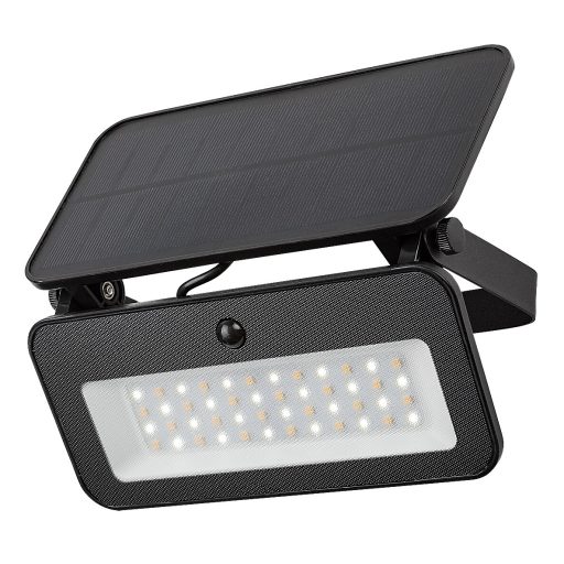 Fekete színű műanyag mozgás-érzékelős, napelemes fali lámpa üveg betétes búrával, beépített LED fényforrással, IP65-ös védelemmel. A led színhőmérséklete kapcsolóval állítható 3000/4000/6500K között. A lámpát a napsugarak 3 óra alatt töltik fel, amivel a lámpa akár 1 órán keresztül üzemel.