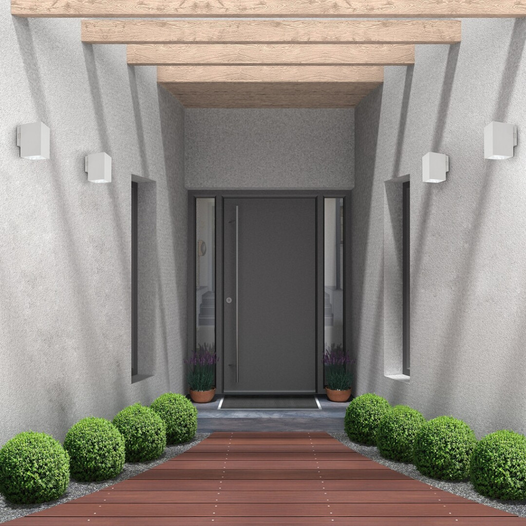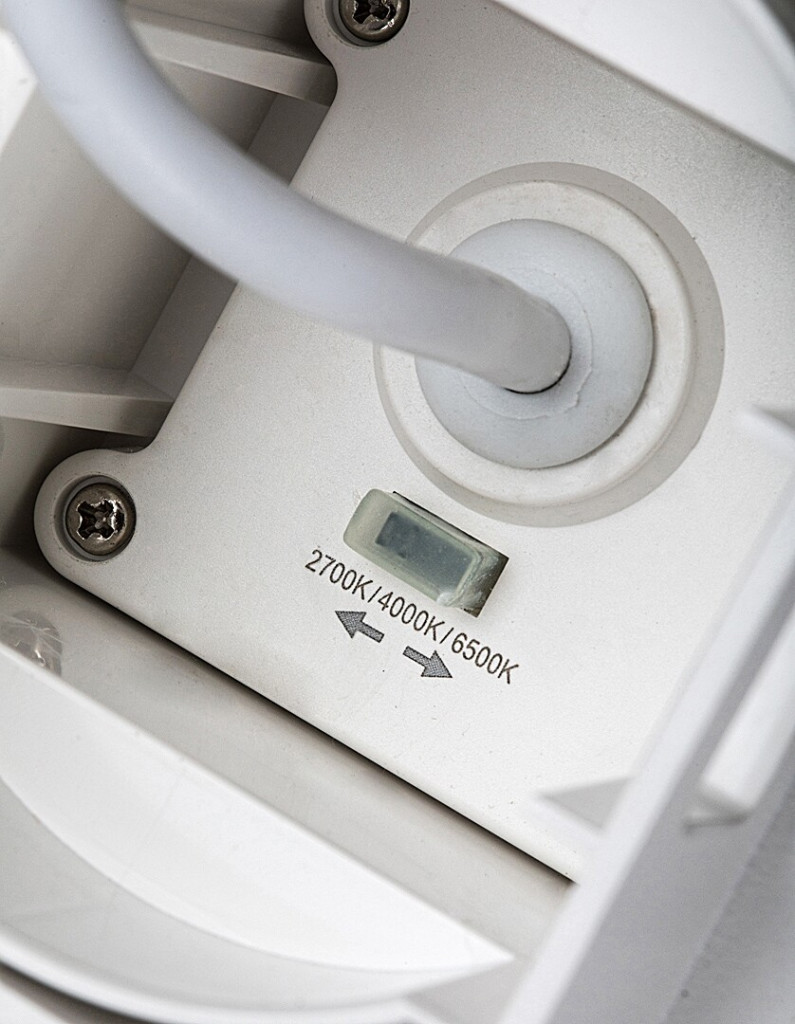 Lefelé világító, fehér színű műanyag kültéri fali lámpa beépített LED fényforrással, IP65-ös védelemmel. A LED színhőmérséklete a lámpán lévő kapcsoló segítségével beállítható 2700/4000/6500Kelvinre, azaz meleg, természetes vagy hideg fehér színhőmérsékletre.