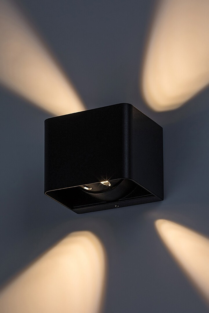 Antracit színű fém, indirekt világító, dekorációs kültéri fali lámpa beépített, meleg fehér színhőmérsékletű LED fényforrással, IP54-es védelemmel. A lámpa állítható fényszórással rendelkezik.