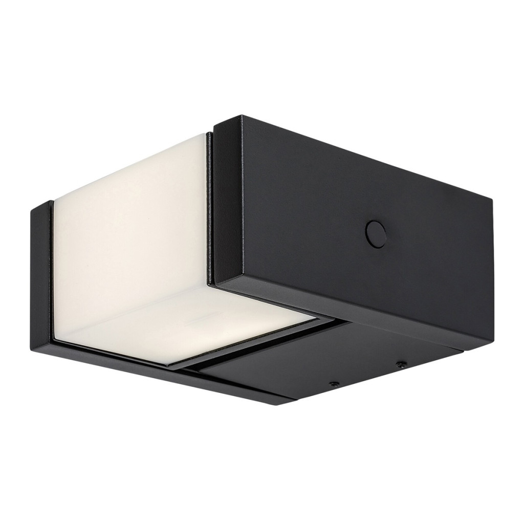 Fekete színű fém kültéri fali lámpa fehér színű, forgatható műanyag búrával, természetes fehér színhőmérsékletű beépített LED fényforrással, IP54-es védelemmel.