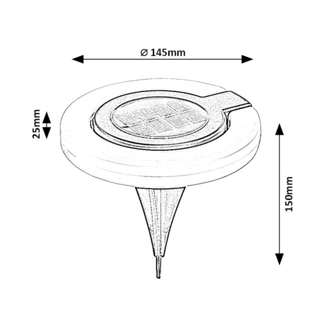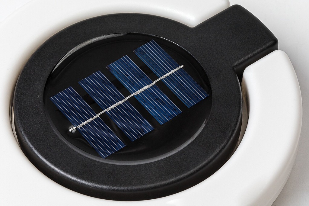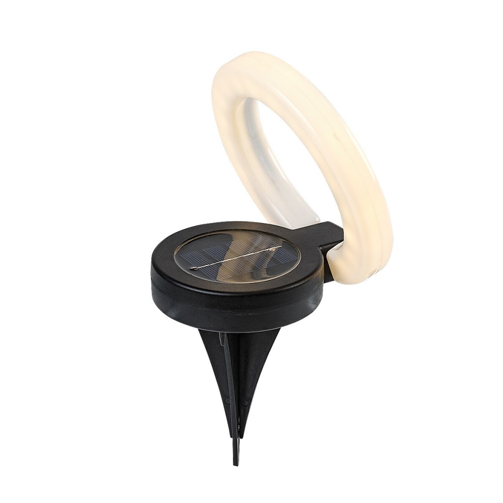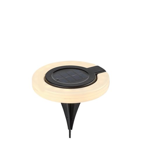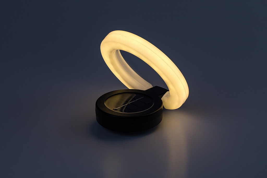 A kerti lámpa fekete testtel és fehér búrával, műanyagból készül. Mivel leszúrója levehető, fehér, fánk formájú része pedig kihajtható, a lámpa multifunkciós: falra is akaszthatjuk. Remek választás bármely modern kertbe, ahol könnyen mozgatható, praktikus lámpára van szükség. Állítható színhőmérsékletű, beépített fényforrással és akkumulátorral rendelkezik. Az akkumulátor 6–8 óra alatt töltődik fel, és ugyanennyi ideig üzemel egy feltöltéssel.