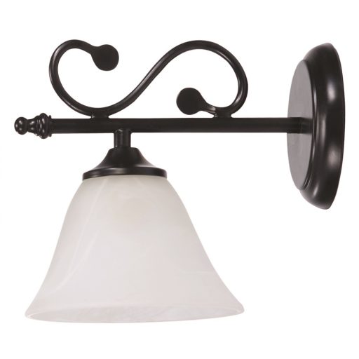 Klasszikus stílusú fali lámpa, matt fekete színű, díszített fém vázzal, fehér színű, alabástrom üveg búrával.