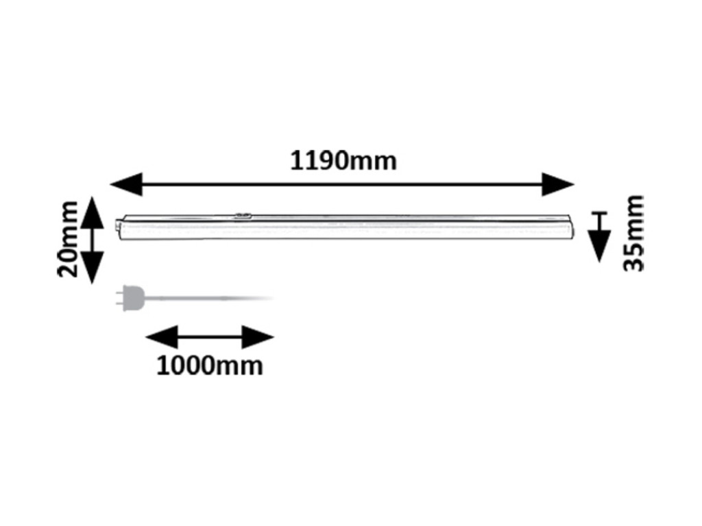 119cm hosszú, fekete és fehér színű műanyag konyhai pultvilágító lámpa beépített LED fényforrással, a lámpatesten kapcsolóval. A lámpa színhőmérséklete 3000/4000K, azaz meleg vagy természetes fehér színhőmérsékletre állítható fali kapcsoló fel/le kapcsolásával. A pultmegvilágító lámpa kábellel vagy kábel nélkül is sorolható.