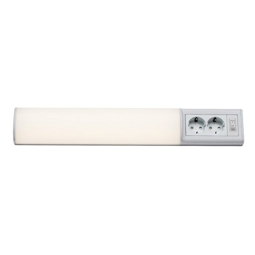 50cm hosszú fém vázas konyhai pultvilágító lámpa fehér színű műanyag búrával, természetes fehér színhőmérsékletű beépített LED fényforrással, 2db 240V csatlakozó aljzattal, lámpatesten elhenyezett kapcsolóval.