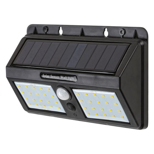Fekete színű műanyag napelemes kültéri fali lámpa mozgásérzékelővel és kis teljesítményű beépített LED fényforrással, IP44-es védelemmel.