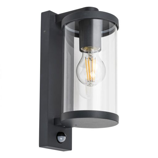 Antracit színű fém vázas mozgás-érzékelős kültéri fali lámpa átlátszó műanyag búrával, IP44-es védelemmel.
